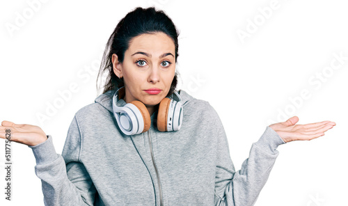 Young hispanic woman wearing gym clothes and using headphones clueless and confused with open arms, no idea and doubtful face.