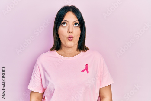 Young hispanic woman wearing pink cancer ribbon on t shirt making fish face with lips, crazy and comical gesture. funny expression.