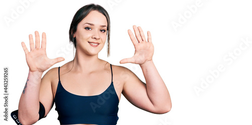 Young hispanic woman wearing sportswear showing and pointing up with fingers number ten while smiling confident and happy.