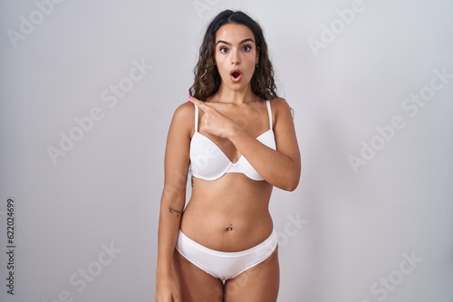 Young hispanic woman wearing white lingerie surprised pointing with finger to the side, open mouth amazed expression.