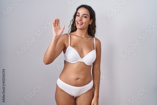Young hispanic woman wearing white lingerie waiving saying hello happy and smiling, friendly welcome gesture