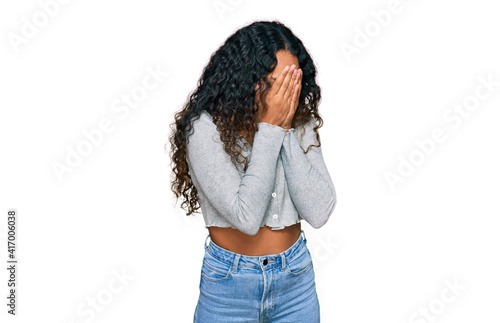 Young hispanic woman with curly hair wearing casual clothes with sad expression covering face with hands while crying. depression concept.