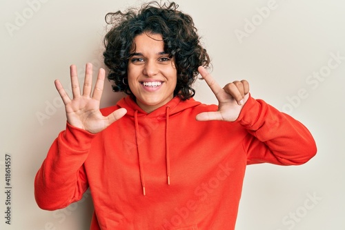 Young hispanic woman with curly hair wearing casual sweatshirt showing and pointing up with fingers number seven while smiling confident and happy.