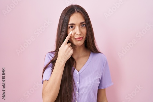 Young hispanic woman with long hair standing over pink background pointing to the eye watching you gesture, suspicious expression