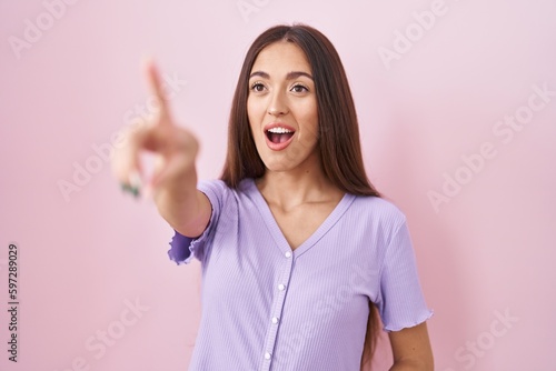 Young hispanic woman with long hair standing over pink background pointing with finger surprised ahead, open mouth amazed expression, something on the front