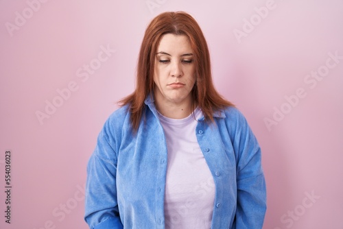 Young hispanic woman with red hair standing over pink background depressed and worry for distress, crying angry and afraid. sad expression.