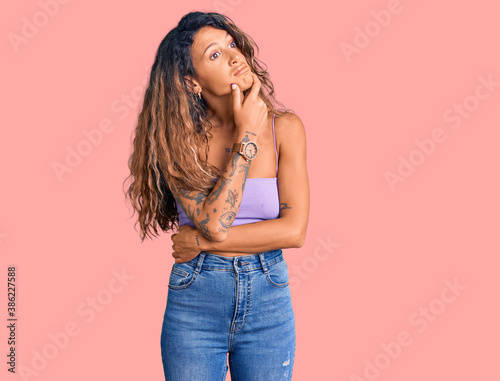 Young hispanic woman with tattoo wearing casual clothes thinking worried about a question, concerned and nervous with hand on chin