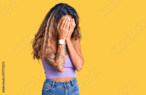 Young hispanic woman with tattoo wearing casual clothes with sad expression covering face with hands while crying. depression concept.