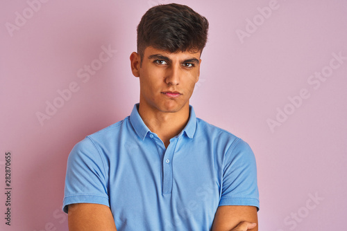 Young indian man wearing blue polo standing over isolated pink background skeptic and nervous, disapproving expression on face with crossed arms. Negative person.