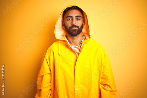 Young indian man wearing raincoat with hood standing over isolated yellow background with serious expression on face. Simple and natural looking at the camera.