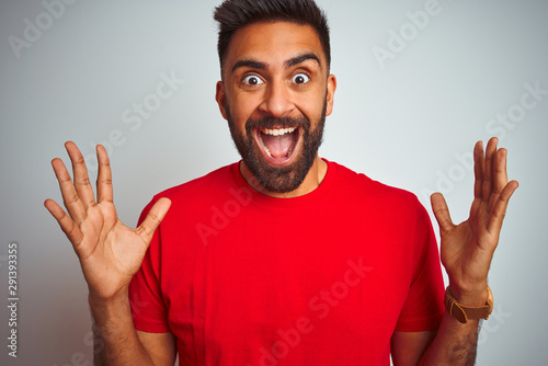 Young indian man wearing red t-shirt over isolated white background celebrating crazy and amazed for success with arms raised and open eyes screaming excited. Winner concept