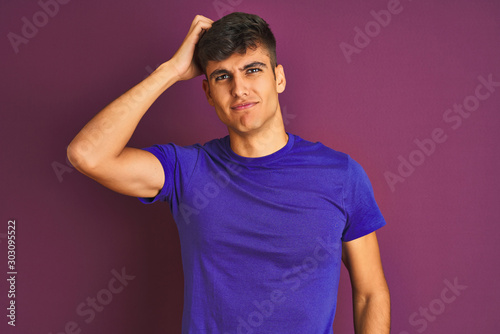 Young indian man wearing t-shirt standing over isolated purple background confuse and wonder about question. Uncertain with doubt, thinking with hand on head. Pensive concept.