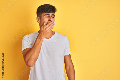 Young indian man wearing white t-shirt standing over isolated yellow background bored yawning tired covering mouth with hand. Restless and sleepiness.