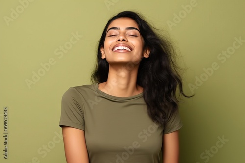 Young Indian Woman in Olive Green T-shirt Expressing Discomfort, Isolated on a Light Olive Green Wall generative ai