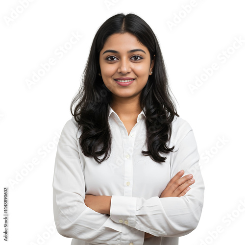 young indian woman in white shirt arms crossed isolated on white or transparent png