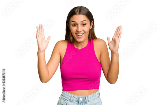 Young Indian woman isolated cutout removal background receiving a pleasant surprise, excited and raising hands.