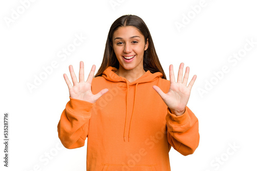 Young Indian woman isolated cutout removal background showing number ten with hands.