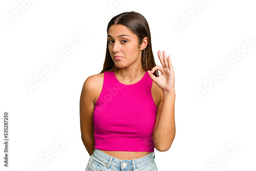 Young Indian woman isolated cutout removal background winks an eye and holds an okay gesture with hand.