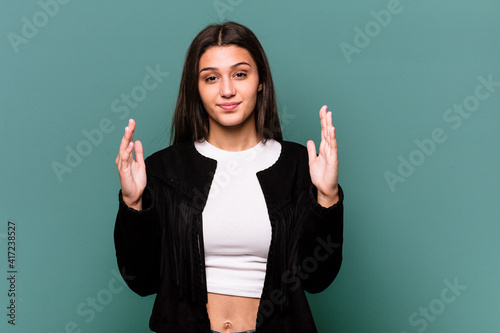 Young Indian woman isolated on blue background holding something little with forefingers, smiling and confident.