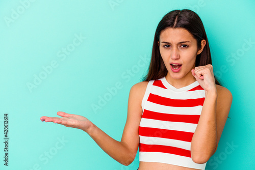 Young Indian woman isolated on blue background holds copy space on a palm, keep hand over cheek. Amazed and delighted.
