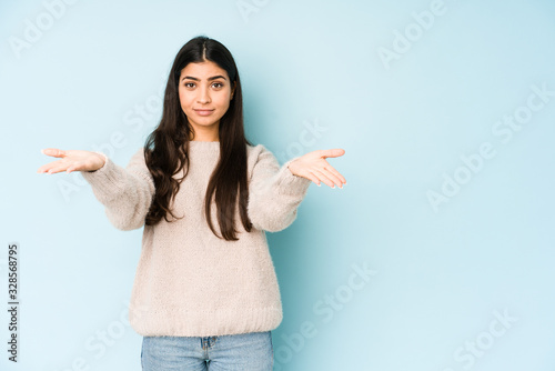 Young indian woman isolated on blue background makes scale with arms, feels happy and confident.