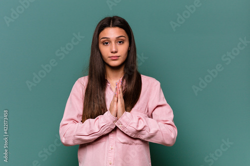 Young Indian woman isolated on blue background praying, showing devotion, religious person looking for divine inspiration.