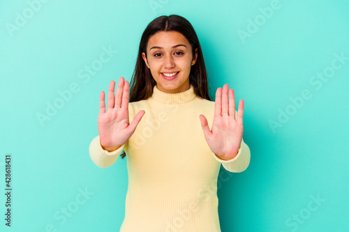 Young Indian woman isolated on blue background showing number ten with hands.