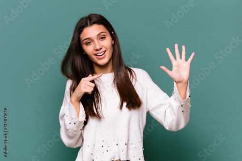 Young Indian woman isolated on blue background smiling cheerful showing number five with fingers.