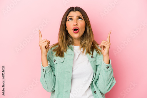 Young indian woman isolated on pink background pointing upside with opened mouth.