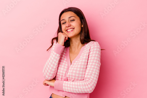 Young Indian woman isolated on pink background smiling happy and confident, touching chin with hand.