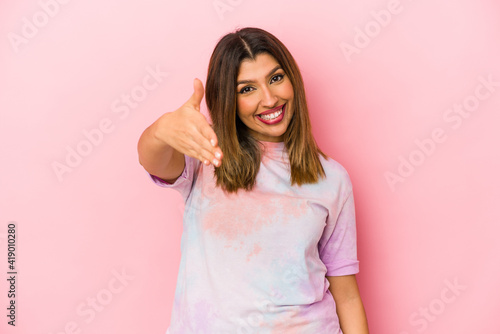 Young indian woman isolated on pink background stretching hand at camera in greeting gesture.
