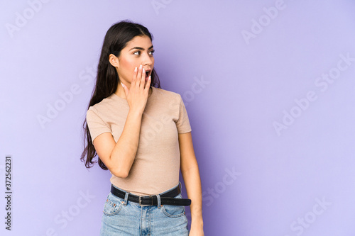 Young indian woman isolated on purple background being shocked because of something she has seen.