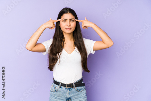 Young indian woman isolated on purple background focused on a task, keeping forefingers pointing head.