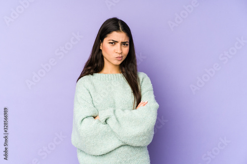 Young indian woman isolated on purple background frowning face in displeasure, keeps arms folded.