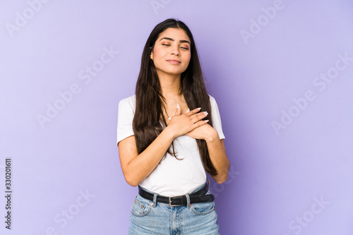 Young indian woman isolated on purple background has friendly expression, pressing palm to chest. Love concept.