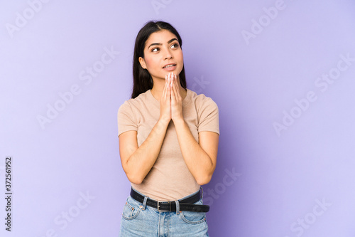 Young indian woman isolated on purple background making up plan in mind, setting up an idea.