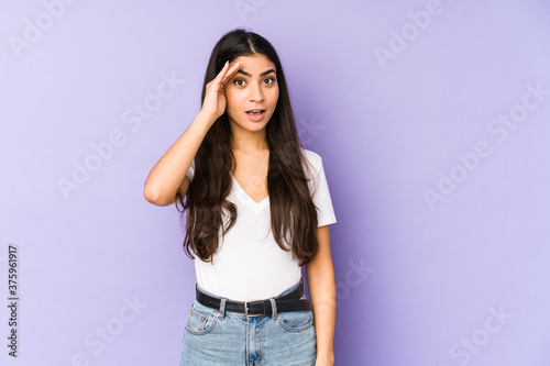 Young indian woman isolated on purple background shouts loud, keeps eyes opened and hands tense.