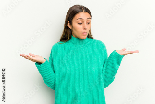 Young Indian woman isolated on white background confused and doubtful shrugging shoulders to hold a copy space.