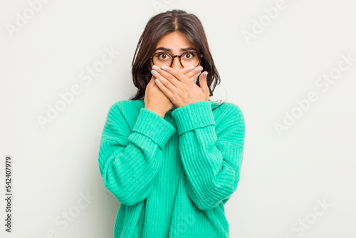 Young Indian woman isolated on white background covering mouth with hands looking worried.
