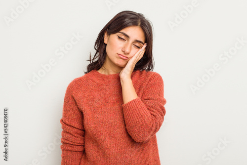Young Indian woman isolated on white background who is bored, fatigued and need a relax day.