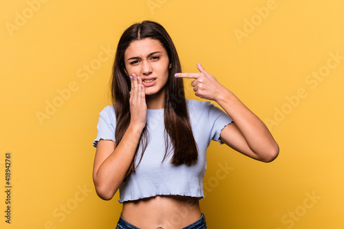 Young Indian woman isolated on yellow background having a strong teeth pain, molar ache.