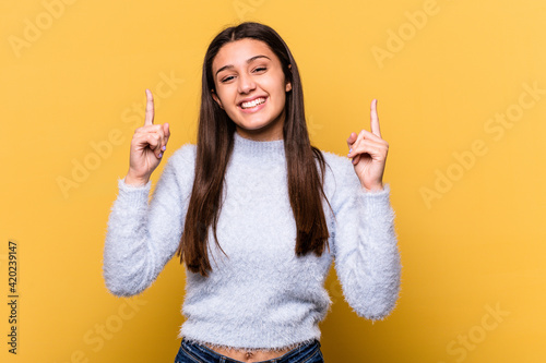 Young Indian woman isolated on yellow background indicates with both fore fingers up showing a blank space.
