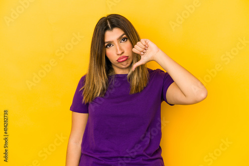 Young indian woman isolated on yellow background showing a dislike gesture, thumbs down. Disagreement concept.