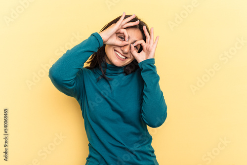 Young Indian woman isolated on yellow background showing okay sign over eyes