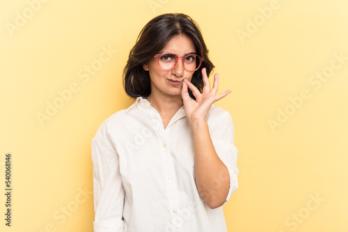 Young Indian woman isolated on yellow background with fingers on lips keeping a secret.