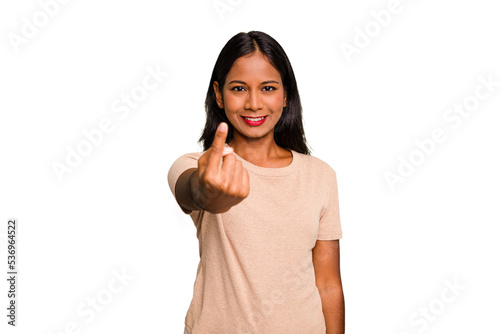 Young Indian woman isolated pointing with finger at you as if inviting come closer.