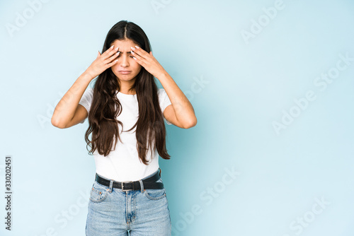 Young indian woman on blue background having a head ache, touching front of the face.