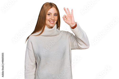 Young irish woman wearing casual winter sweater smiling positive doing ok sign with hand and fingers. successful expression.