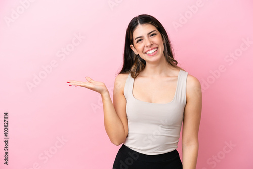 Young Italian woman isolated on pink background holding copyspace imaginary on the palm to insert an ad