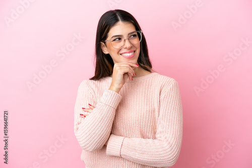 Young Italian woman isolated on pink background With glasses and thinking while looking up
